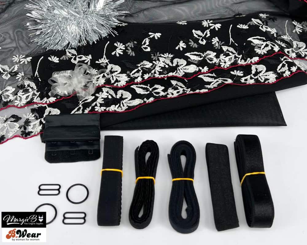 Includes lingerie satin for the cups, power net for the back band, beautifully embroidered lace for trim or layering on the cups.